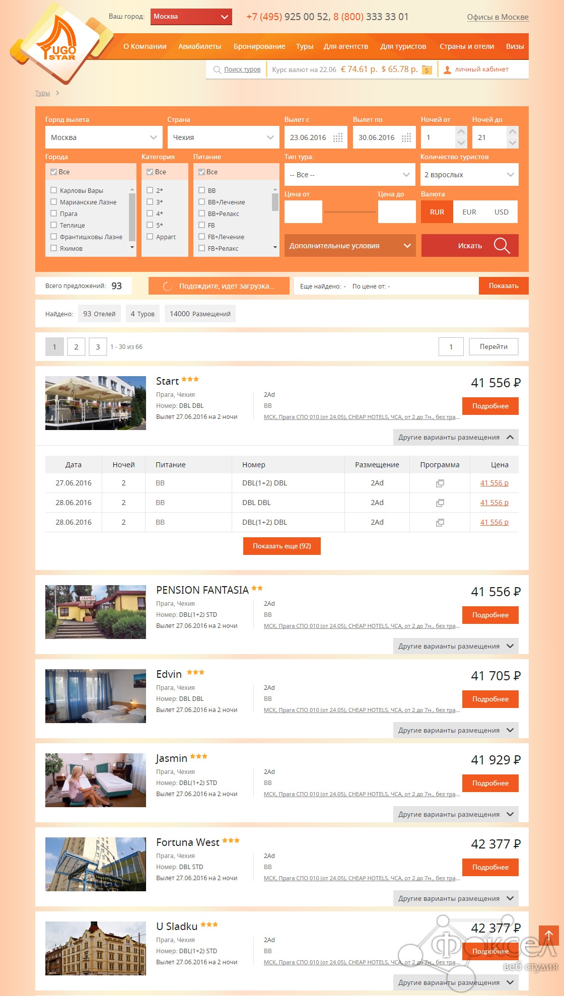 - поиск отелей по стране, городу и звездности и прочим параметрам